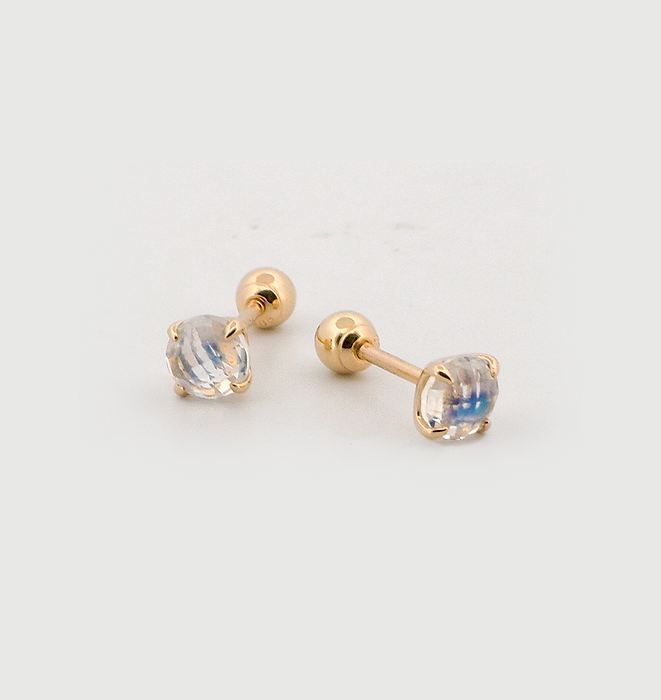 Limited edition solid gold cartilage earring set with a round checker cut, high grade rainbow moonstone set in a tapered claw setting.