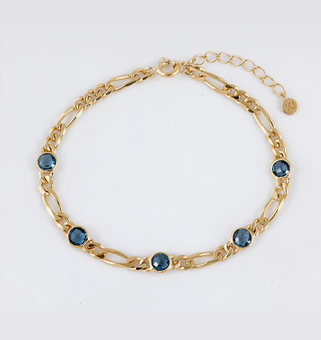 The Ava bracelet features natural bezel-set London blue topaz gemstones nestled within a mixed link, flat curb chain design. London blue topaz represents truth and tranquility, traditionally believed to deepen bonds of love and strengthen loyalty in relationships.