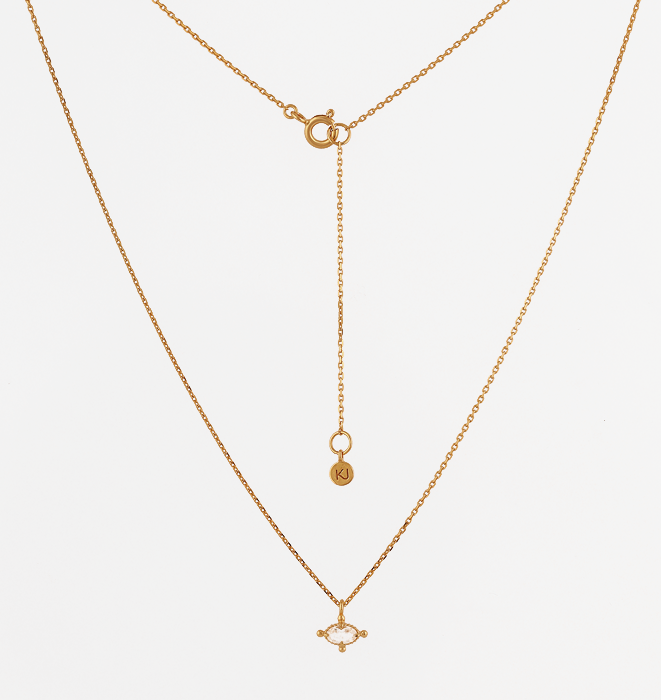 The Eos petite necklace is crafted to be worn alone or layered with others. It showcases a bezel-set rainbow moonstone pendant hanging from a slender chain. This necklace symbolizes the promise of new beginnings.