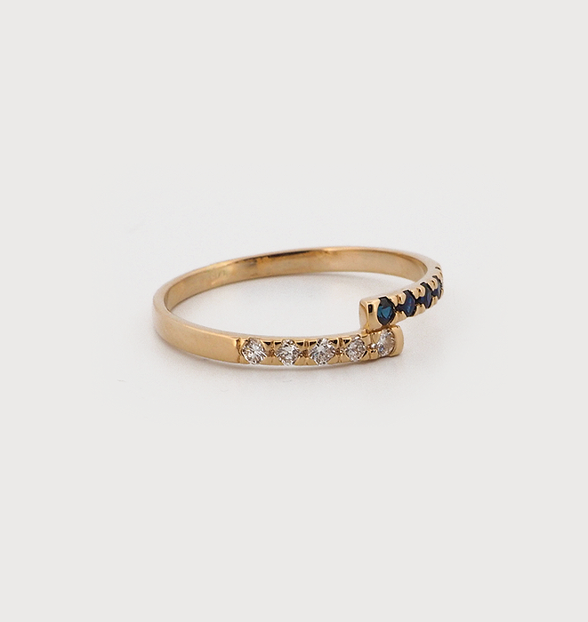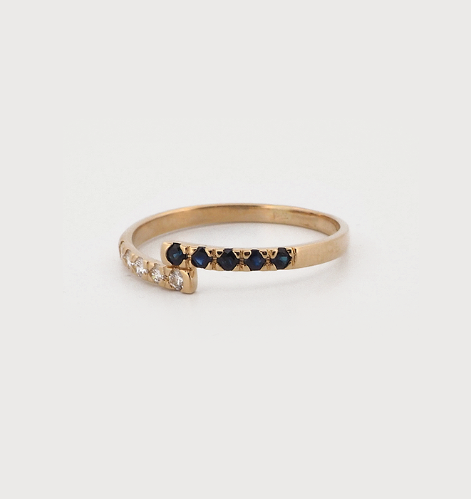 The Bliss Ring pairs sapphires and diamonds equally, each gemstone claiming half the band in a refined minimalist crossover design. A versatile ring made in solid 14k gold that can be worn every day solo or layered with your favorites.