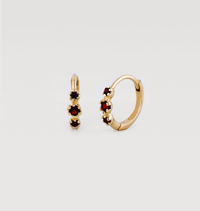 Crafted from 14k solid gold, these hinged huggy earrings feature three stunning natural garnets in a distinctive claw setting that catches the light beautifully. The secure hinge design makes them ideal for daily wear. Perfect for firsts and second piercings.