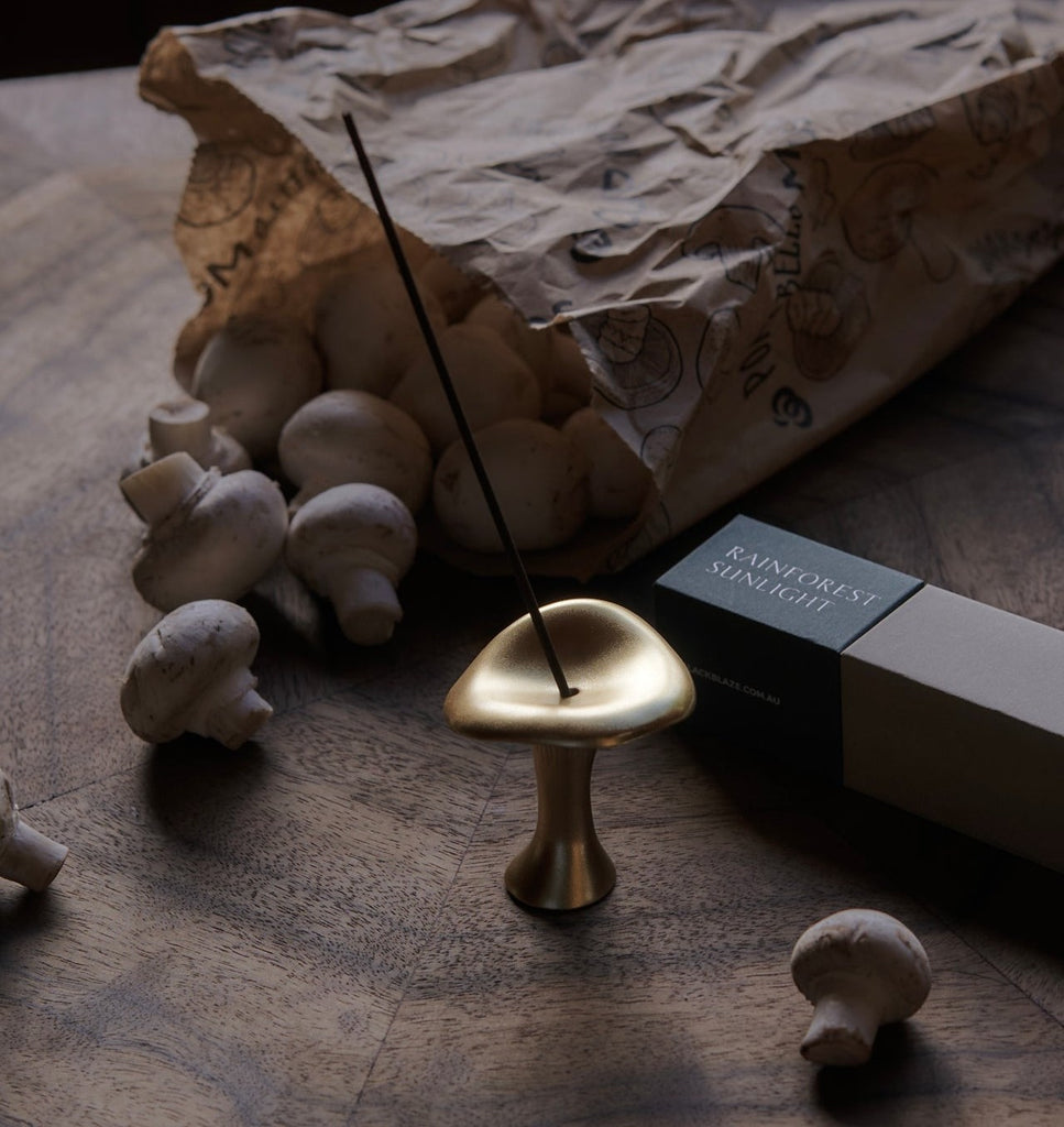 Mushroom Incense Burner is crafted from solid brass, its unique mushroom shape adds a serene, natural ambiance when burning incense. When not in use, it doubles as an elegant decor item, adding charm to any space.