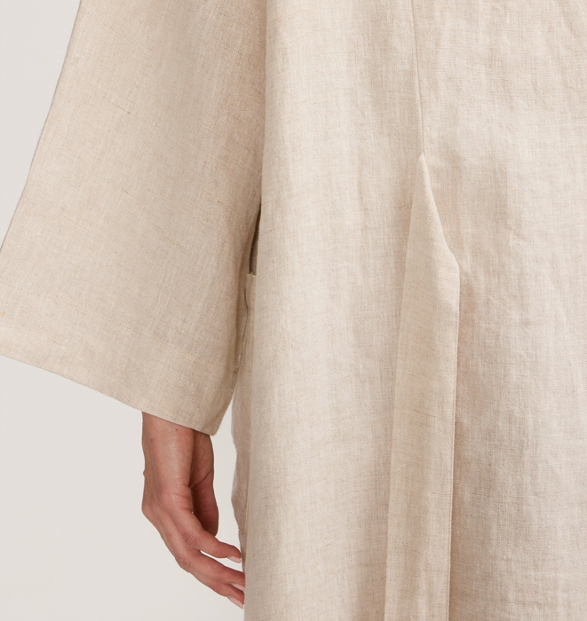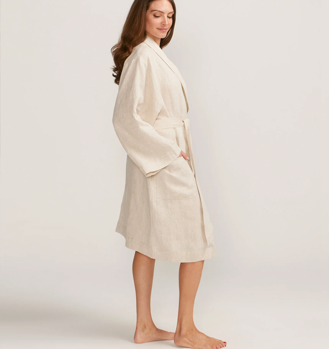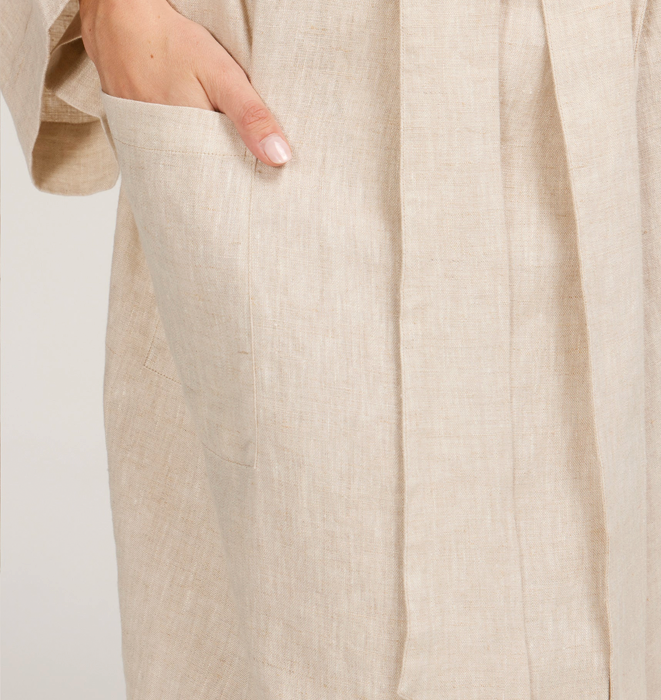 Designed to become part of your daily rituals. Our luxurious linen robe features a convenient sewn-in waist tie, extra wide sleeves and spacious pockets.