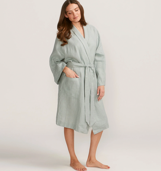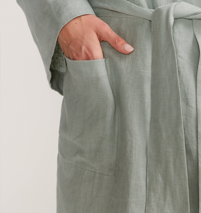 Designed to become part of your daily rituals. Our luxurious linen robe features a convenient sewn-in waist tie, extra wide sleeves and spacious pockets.