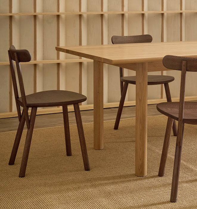 Itamae consists of two lengths of solid oak tabletop supported by large cylindrical legs. This table has a robust presence and forms a focal point for friends to gather around. A simple appearance lets the quality of the natural oak become the main attraction. Available in two lengths, Itamae is also ideal as a sharing desk or a meeting table in the work environment.