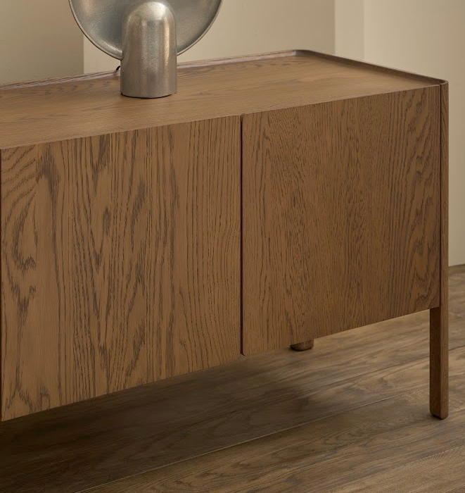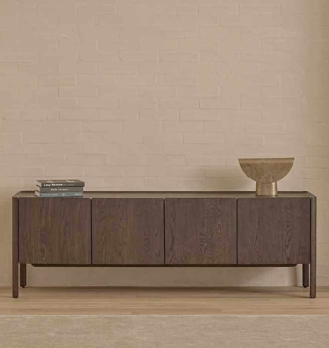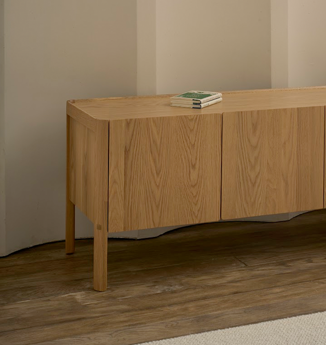 Nell Credenza is a composition of harmonious details that form a contemporary living room statement piece. Each element invites attention and tactile interaction. The scalloped top shelf provides a safe top surface, while the front edge opens the doors revealing ample storage. Nell celebrates the beauty of timber joinery and timeless architectural forms.