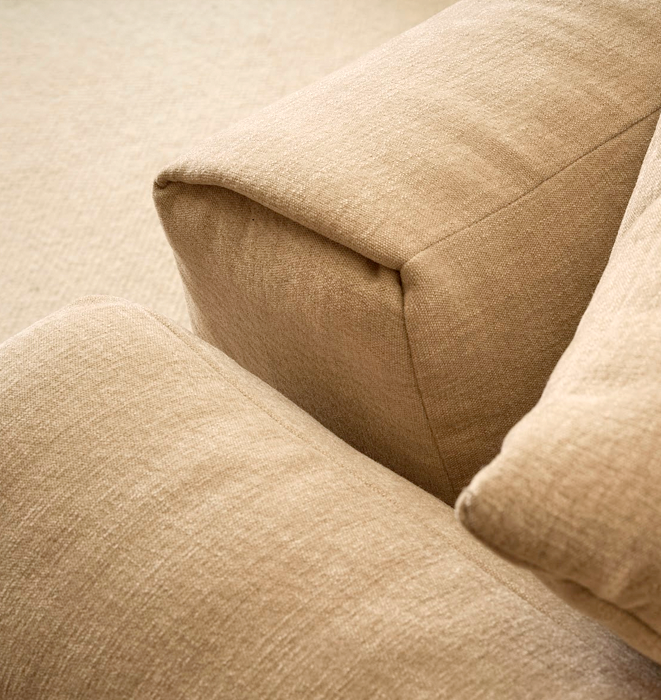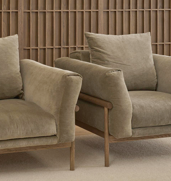 The Timm sofa is defined by an expertly crafted solid oak external frame that exudes timeless elegance. The arms of the sofa are elegantly folded over the wood frame, creating a subtle harmony between the soft and hard elements of the sofa, while also providing a distinctive but relaxed look.
